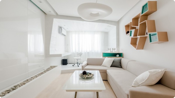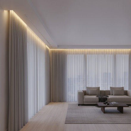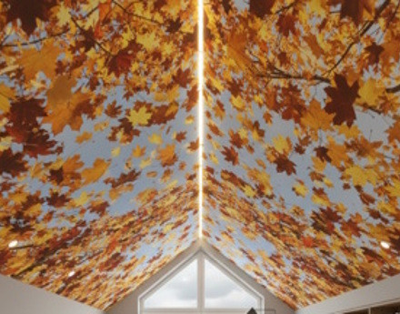 Ткань хорошо смотрится с фотопечатью или чисто белой (примеры решений из каталога). Зрительно этот прием увеличивает поверхность и улучшает восприятие, полностью меняя его.