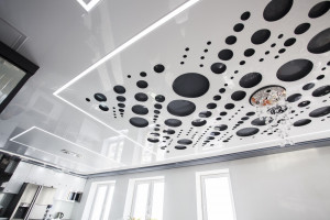 Такой натяжной потолок может идти со вставками правильными и асимметричными. Представлен в геометрии разных цветов, как и матовый — смотрите каталог. При выборе дизайна нужно смотреть не только на цвета и фактуры, многоуровневая конструкция или нет, но и на время/способ монтажа, пожарную безопасность натяжного полотна.