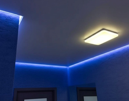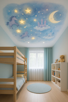 Если нужен красивый дизайн, выбирайте варианты установки попроще. Натяжные пленки из ПВХ в матовой фактуре любого производителя с фотопечатью или комбинированные потолки с цветными вставками, особенно двухуровневые или многоуровневые. В зависимости от особенностей помещения изготавливаются за несколько часов.