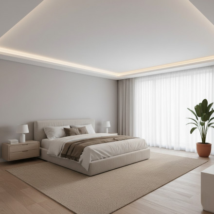 Для спальни, гостиной или детской мы рекомендуем устанавливать сертифицированные натяжные полотна из ткани с алюминиевым багетом стандартной конфигурации. Главное, они безопасны для детей, не вредят здоровью, не имеют неприятного запаха. Такие натяжные потолки хорошо выглядят, вентилируются за счет сетчатой фактуры, переносят минусовую температуру, а монтаж проводится без тепловой пушки. В классическом дизайне это хороший вариант, в цвете также смотрится приятно.