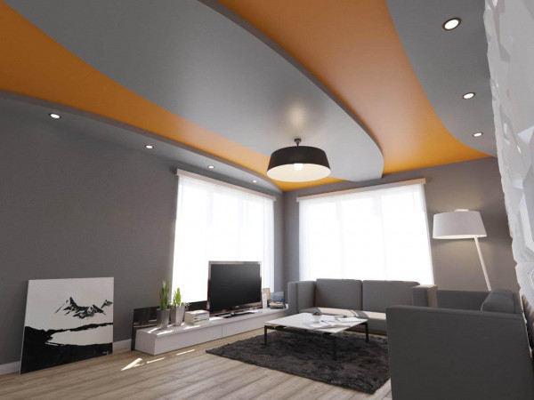 Для расстановки акцентов двухуровневый потолок монтируют в контрастных сочетаниях цветов и/или фактур, а если нужно подчеркнуть камерность, подойдет монохромный дуэт.