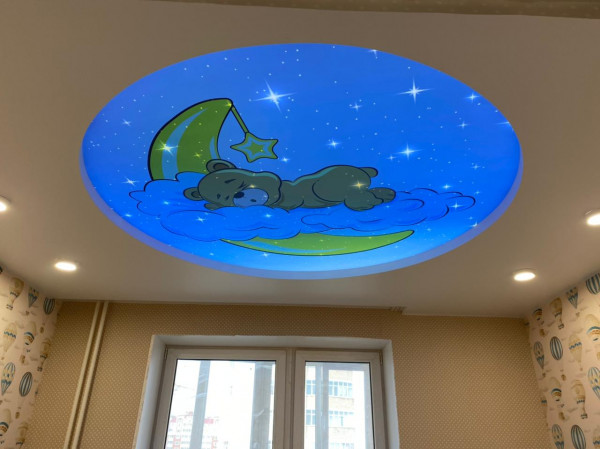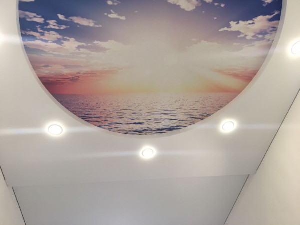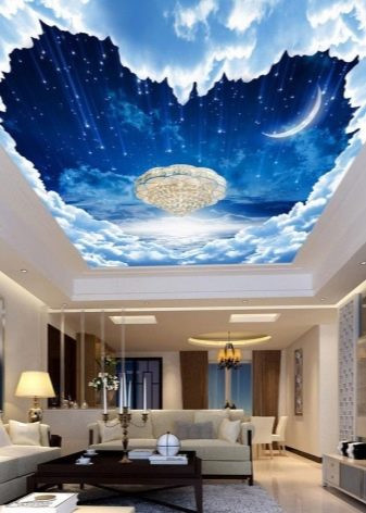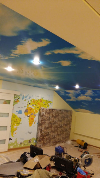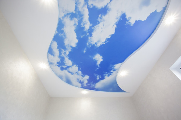 Натяжной потолок «Небо с облаками» хорошо показал себя в комнатах любого назначения, будь то жилые пространства или общественные помещения. Мягкая красота отделки особенно выигрышна со встроенной подсветкой, но и без нее потолок смотрится эстетично и ярко.