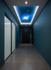 Чтобы сделать потолок главным акцентом коридора, выбирайте декоративные варианты: перфорацию, ниши, печать. А для визуального расширения пространства подойдут оптические иллюзии. Картинка распечатывается на всей площади потолка, создавая ощущение второго этажа над головой.