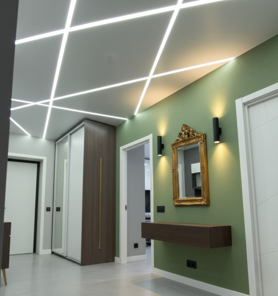 Идеальная геометрия углов без маскировочных лент и потолочных плинтусов, только четкость линий — это теневые конструкции.